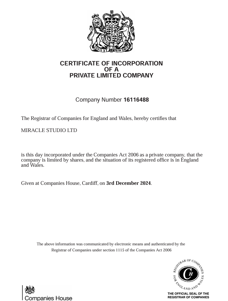 Certificate query address:https://find-and-update.company-information.service.gov.uk/company/16116488 https://t.me/MIRACLESTUDIO11 Miracle Studio partners with Netflix, HBO Max, Fox Entertainment, iQiyi and other entertainment giants